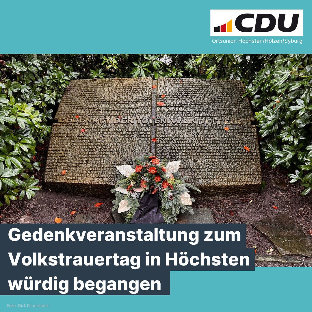 Am Volkstrauertag haben die CDU-Ortsunion Höchsten/Holzen/Syburg und der SPD-Ortsverein Ardey erstmals gemeinsam die traditionelle Gedenkfeier im Ehrenhain an der Wittbräucker Straße ausgerichtet. Nachdem die Interessengemeinschaft Höchsten, die diese Aufgabe viele Jahre getragen hatte, sich aufgelöst hat, führen CDU und SPD die wichtige Tradition nun kooperativ fort.