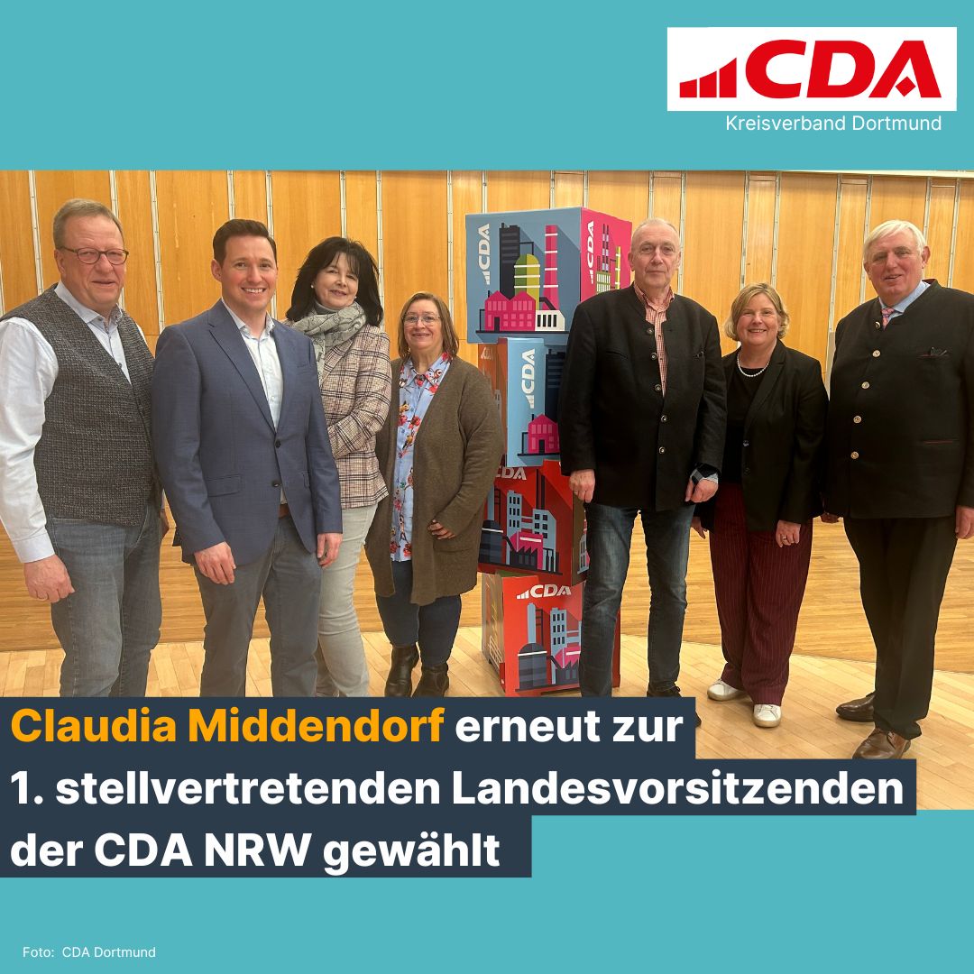 Auf der Landestagung am 15. November in Kamen ist die Kreisvorsitzende der CDA Dortmund, Claudia Middendorf, mit über 98 % der Stimmen erneut zur 1. stellvertretenden CDA-Landesvorsitzenden gewählt worden. Der Landtagsabgeordnete Daniel Scheen-Pauls wurde ebenfalls in seinem Amt als Landesvorsitzender bestätigt.