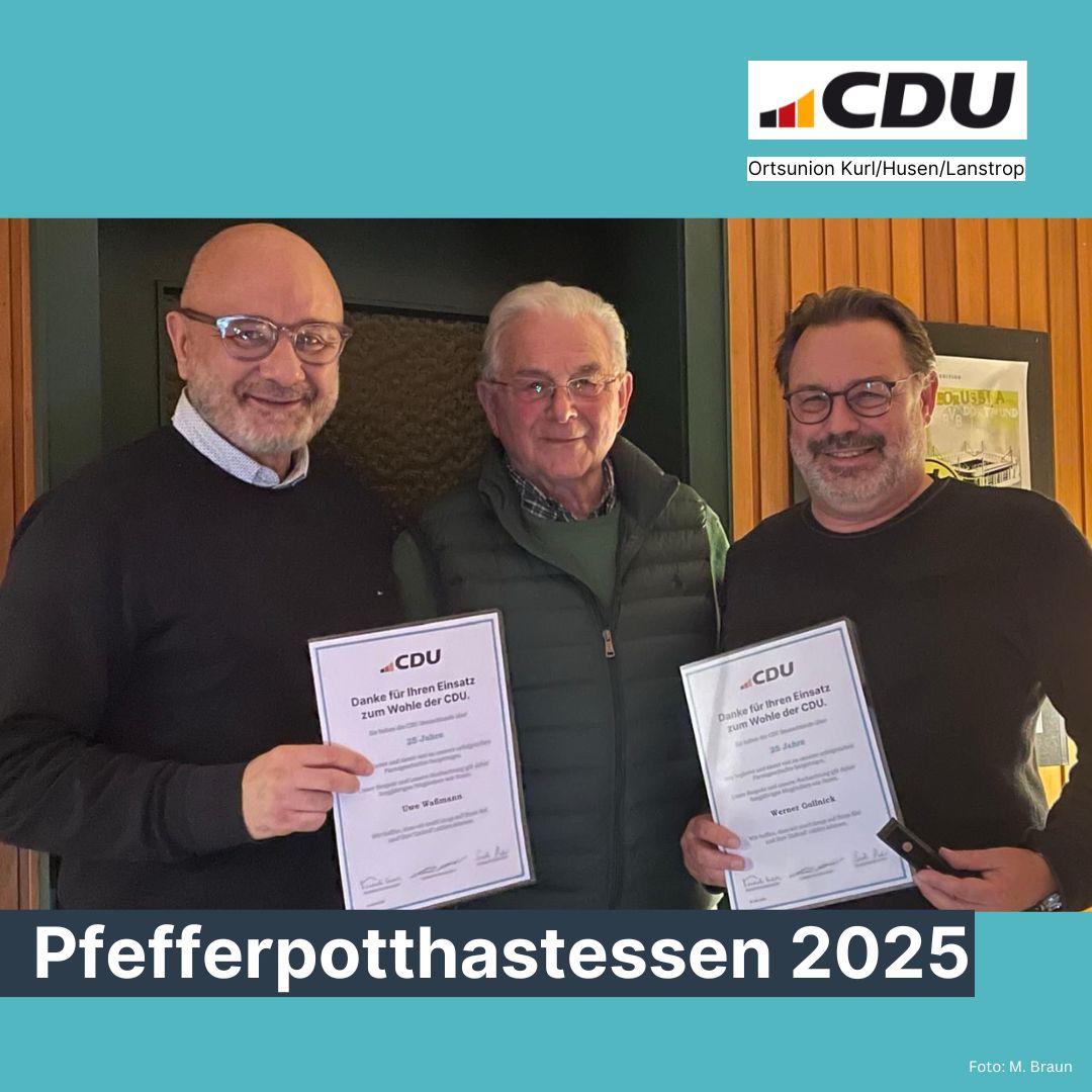 In der CDU Ortsunion Kurl/Husen/Lanstrop hat am 28.11.2025 das traditionelle Pfefferpotthastessen stattgefunden. Zudem wurden in diesem Rahmen die Jubilare der Ortsunion geehrt.