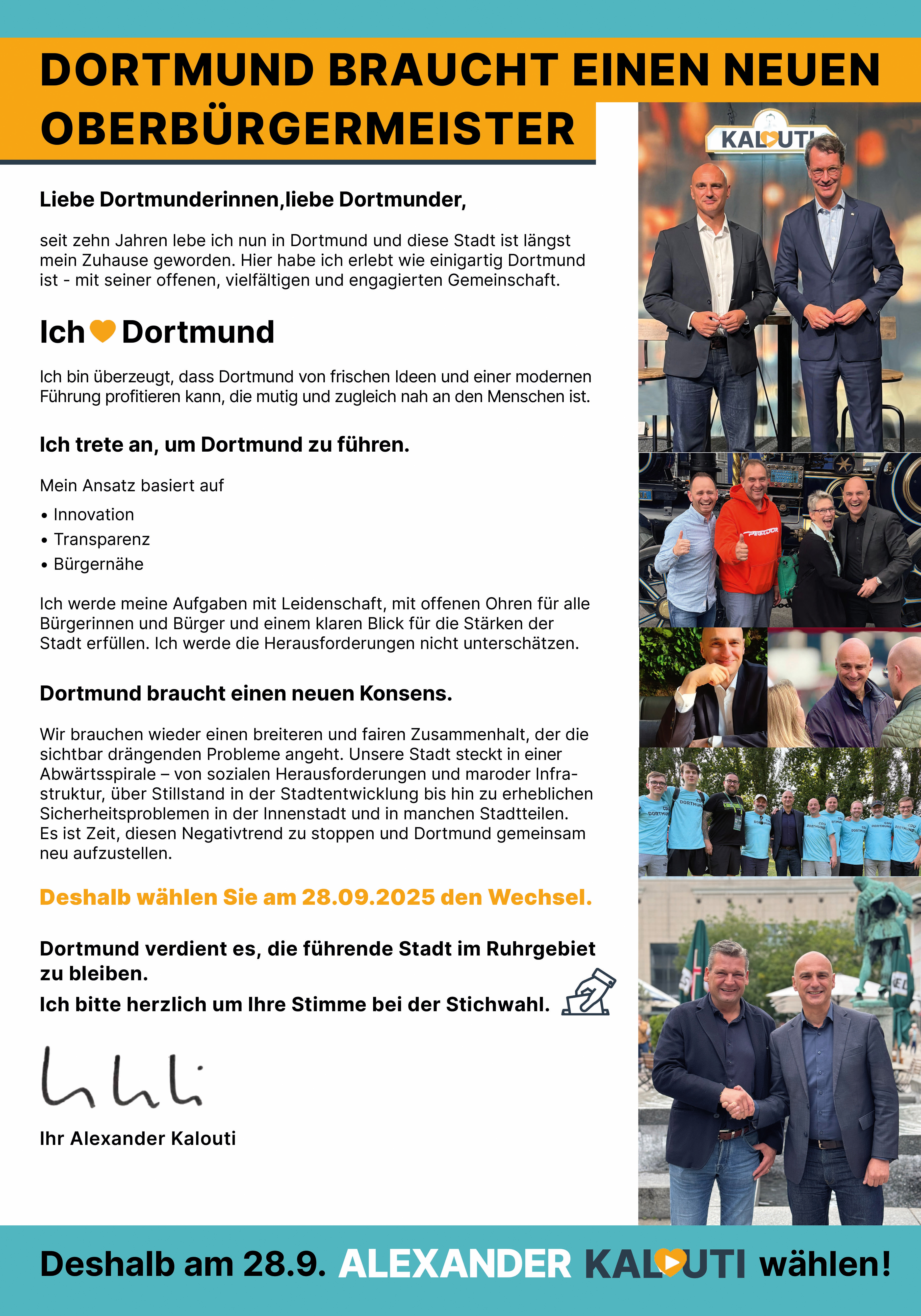 Gemeinsam schaffen wir jetzt einen Politikwechsel in Dortmund, indem wir Alexander Kalouti am 28. September zum Oberbürgermeister machen!