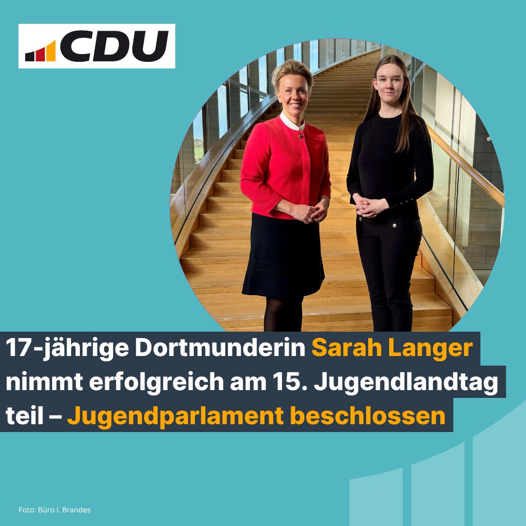 Dortmund/Düsseldorf – Drei Tage lang hat die 17-jährige Sarah Langer aus Dortmund als Vertreterin der Dortmunder CDU-Landtagsabgeordneten Ina Brandes am 15. Jugendlandtag des Landtags Nordrhein-Westfalen teilgenommen. Gemeinsam mit rund 200 jungen Menschen im Alter von 16 bis 20 Jahren arbeitete sie zu konkreten politischen Themen – etwa der Einrichtung eines dauerhaften Jugendparlaments, dem Vorschlag eines kostenfreien Deutschlandtickets für junge Menschen sowie Fragen rund um Jugendgewalt in Nordrhein-Westfalen. In Anhörungen mit Expertinnen und Experten erhielten die Teilnehmerinnen und Teilnehmer vertiefende Informationen, erarbeiteten in ihren Fraktionen eigene Positionen und diskutierten diese anschließend in den Ausschüssen.