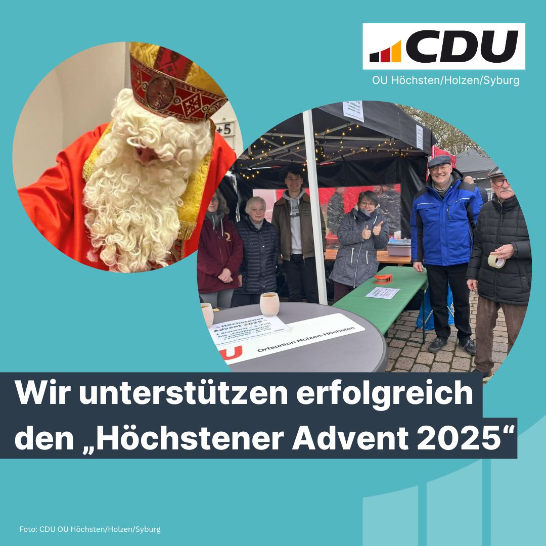 Beim diesjährigen Höchstener Advent, der traditionsgemäß am ersten Adventssonntag von der Werbegemeinschaft Höchsten vor der evangelischen Kirche am Grenzweg ausgerichtet wurde, war die Ortsunion Höchsten/Holzen/Syburg erneut mit großem Engagement vertreten. Viele Vereine, Institutionen und Parteien bereicherten die stimmungsvolle Veranstaltung mit kulinarischen Angeboten und handgemachten Produkten – und trugen so zu einer beachtlichen Spendensumme für den guten Zweck bei.
