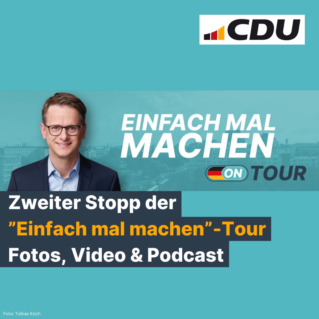 Weiter geht’s in Neumünster (Schleswig-Holstein) am 19.01.2026, Kirchzarten (Baden-Württemberg) am 02.02.2026, Mainz (Rheinland-Pfalz) am 09.03.2026 und 27.04.2026, 18:00 Uhr, Paderborn (NRW)– wir freuen uns, wenn Sie dann live mit vor Ort sind. Melden Sie sich gerne schon an unter https://www.einfach-mal-machen-tour.cdu.de/.